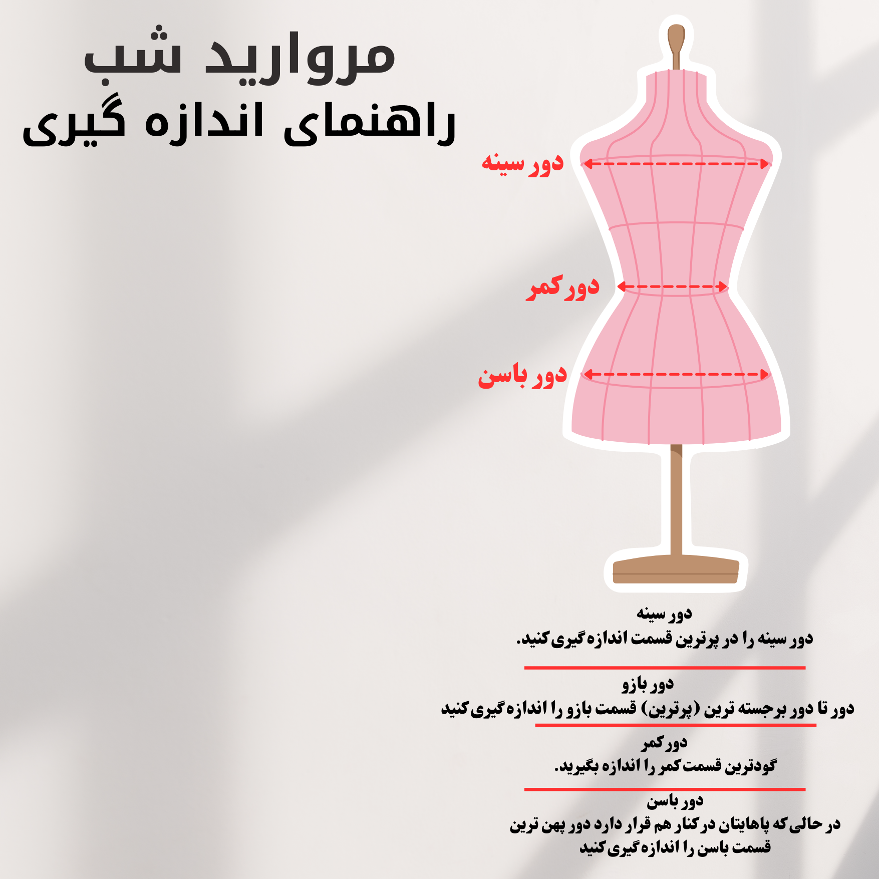 | سایز | دور سینه | دور کمر | دور بازو | عرض سرشانه | قد آستین | قدکار |