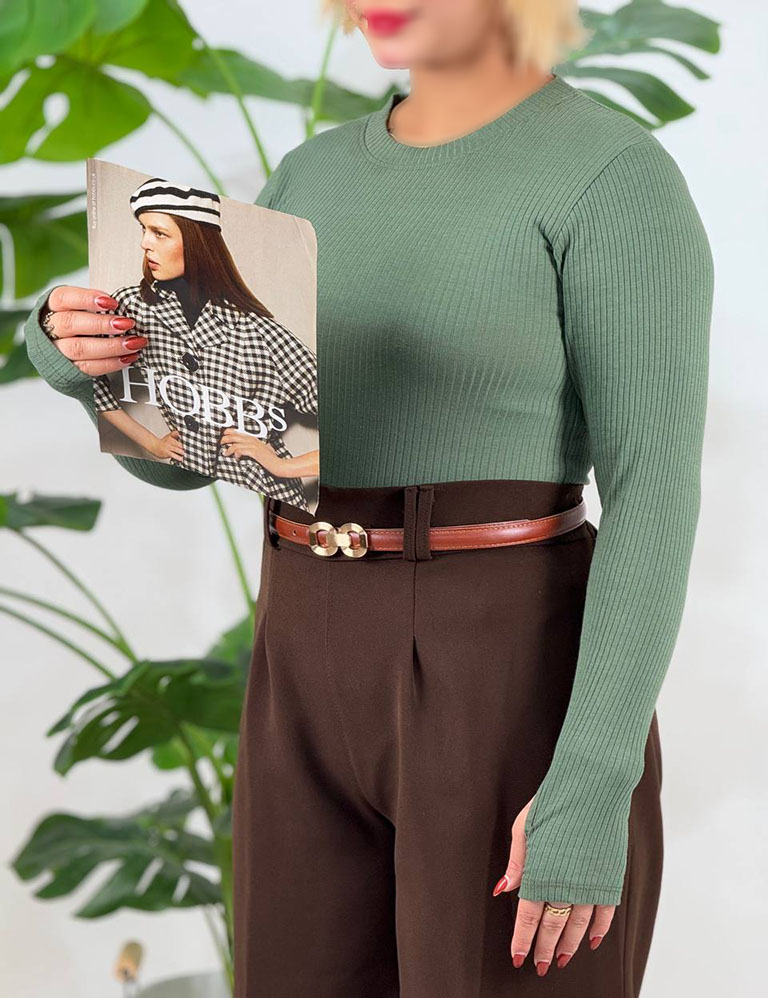 یقه گرد این مدل، ظاهر مینیمال و سادهای ایجاد میکند که بهراحتی با انواع زیورآلات، گردنبندهای کوتاه، کتهای جلوباز، مانتوهای اسپرت یا شومیزهای رویه قابل ست شدن است. این طراحی کمک میکند توجه روی فرم کلی لباس باقی بماند و درعینحال برای موقعیتهای رسمیتر نیز مناسب باشد.